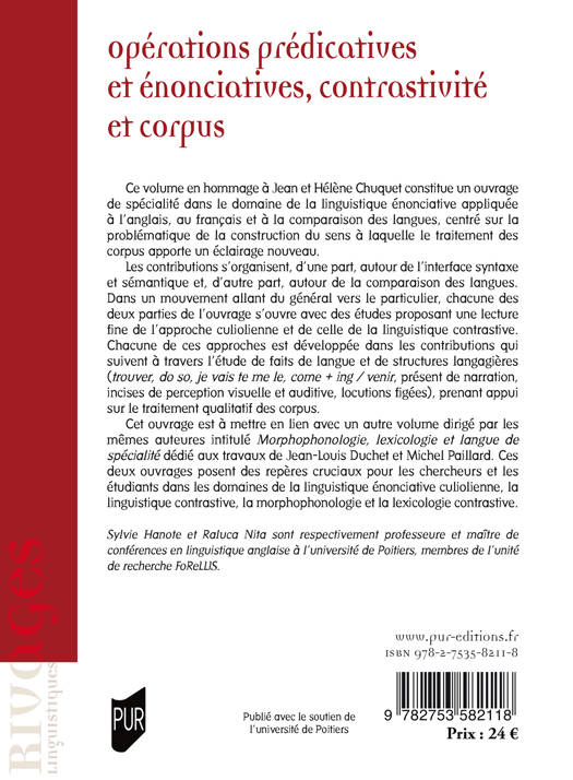 Les contributions de ce volume s'organisent autour de l'interface syntaxe et sémantique et autour de la comparaison des langues. Dans un mouvement allant du général vers le particulier, chacune des deux parties s'ouvre avec des études proposant une lecture fine de l'approche culiolienne et de celle de la linguistique contrastive. Chacune de ces approches est développée dans les contributions qui suivent à travers l'étude de faits de langue et de structures langagières (trouver, do so, je vais te me le, come + ing / venir, présent de narration, incises de perception visuelle et auditive, locutions figées), prenant appui sur le traitement qualitatif des corpus.
