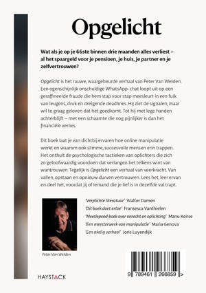 Opgelicht is het rauwe, waargebeurde verhaal van Peter Van Welden. Een ogenschijnlijk onschuldige WhatsApp-chat loopt uit op een geraffineerde fraude die hem stap voor stap meesleurt in een fuik van leugens, druk en dreigende deadlines. Hij ziet de signalen, maar wil te graag geloven dat het goedkomt. Tot hij met lege handen achterblijft – met een schaamte die nog pijnlijker is dan het financiële verlies.