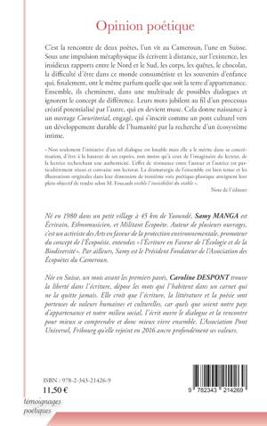 C'est la rencontre de deux poètes, l'un vit au Cameroun, l'une en Suisse. Sous une impulsion métaphysique ils écrivent à distance, sur l'existence, les insidieux rapports entre le Nord et le Sud, les corps, les quêtes, le chocolat, la difficulté d'être dans ce monde consumériste et les souvenirs d'enfance qui, finalement, ont le même parfum quelle que soit la terre d'appartenance. Ensemble, ils cheminent, dans une multitude de possibles dialogues et ignorent le concept de différence. Leurs mots jubilent au fil d'un processus créatif potentialisé par l'autre, qui en devient muse. Cela donne naissance à un ouvrage Coeuritorial, engagé, qui s'inscrit comme un pont culturel vers un développement durable de l'humanité par la recherche d'un écosystème intime.