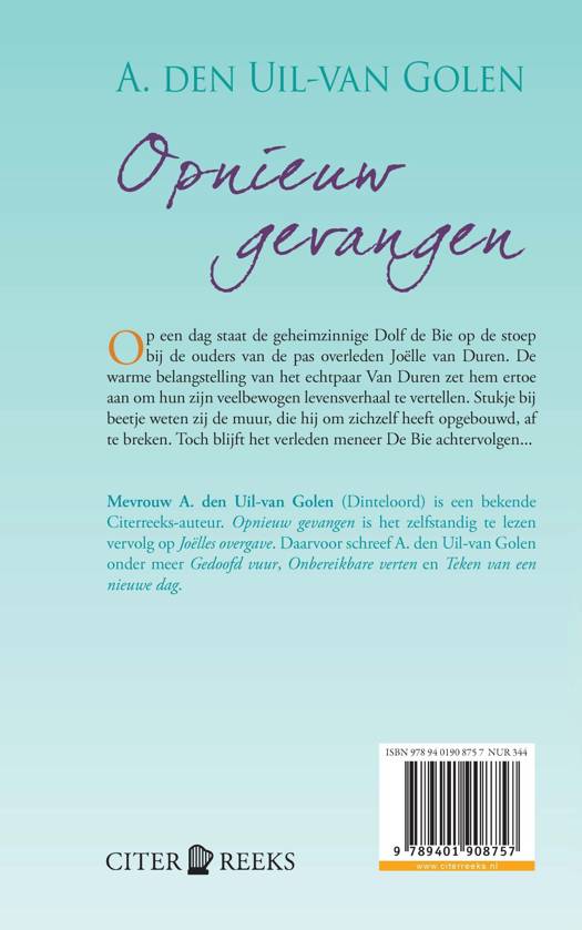 Dit bijzondere en ontroerende verhaal is het nieuwste werk van Aja den Uil-van Golen, die al een behoorlijk aantal romans over de meest uiteenlopende onderwerpen op haar naam heeft staan. Opnieuw gevangen is een zelfstandig te lezen vervolg op Joëlles overgave.