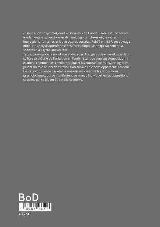 « Oppositions psychologiques et sociales » de Gabriel Tarde est une oeuvre fondamentale qui explore les dynamiques complexes régissant les interactions humaines et les structures sociales. Publié en 1897, cet ouvrage offre une analyse approfondie des forces d'opposition qui façonnent la société et la psyché individuelle. Tarde, pionnier de la sociologie et de la psychologie sociale, développe dans ce livre sa théorie de l'imitation en l'enrichissant du concept d'opposition. Il examine comment les conflits sociaux et les contradictions psychologiques jouent un rôle crucial dans l'évolution sociale et le développement individuel. L'auteur commence par établir une distinction entre les oppositions psychologiques, qui se manifestent au niveau individuel, et les oppositions sociales, qui se jouent à l'échelle collective. Il analyse ensuite comment ces forces antagonistes interagissent et s'influencent mutuellement, créant des dynamiques complexes qui sous-tendent le changement social. Ce livre s'inscrit naturellement dans les catégories « Sociologie », « Psychologie sociale » et « Théorie sociale » sur les plateformes de vente en ligne. Tarde y déploie une approche novatrice qui jette les bases de nombreuses théories sociologiques ultérieures. « Oppositions psychologiques et sociales » ne se contente pas d'être un traité théorique ; il offre des applications concrètes à divers domaines, de la criminologie à l'économie politique. Tarde examine comment les oppositions se manifestent dans différentes sphères de la vie sociale, offrant des insights précieux sur les mécanismes du changement social et de l'innovation. L'ouvrage se distingue par sa capacité à relier les niveaux micro et macro de l'analyse sociale. Tarde montre comment les oppositions individuelles peuvent se transformer en mouvements sociaux plus larges, et inversement, comment les conflits sociétaux influencent la psychologie individuelle. Bien qu'écrit il y a plus d'un siècle, « Oppositions psychologiques et sociales » reste d'une étonnante actualité. Les réflexions de Tarde sur la nature dialectique du progrès social et sur le rôle des contradictions dans l'innovation continuent d'éclairer notre compréhension des dynamiques sociales contemporaines.