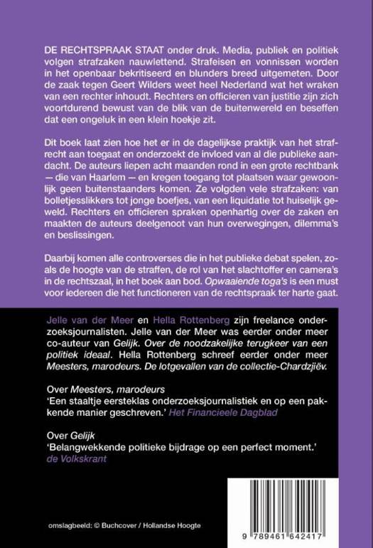 Dit boek laat zien hoe het er in de dagelijkse praktijk van het strafrecht aan toegaat en onderzoekt de invloed van al die publieke aandacht. De auteurs liepen acht maanden rond in een grote rechtbank - die van Haarlem - en kregen toegang tot plaatsen waar gewoonlijk geen buitenstaanders komen. Ze volgden vele strafzaken: van bolletjesslikkers tot jonge boefjes, van een liquidatie tot huiselijk geweld. Rechters en officieren spraken openhartig over de zaken en maakten de auteurs deelgenoot van hun overwegingen, dilemma's en beslissingen.