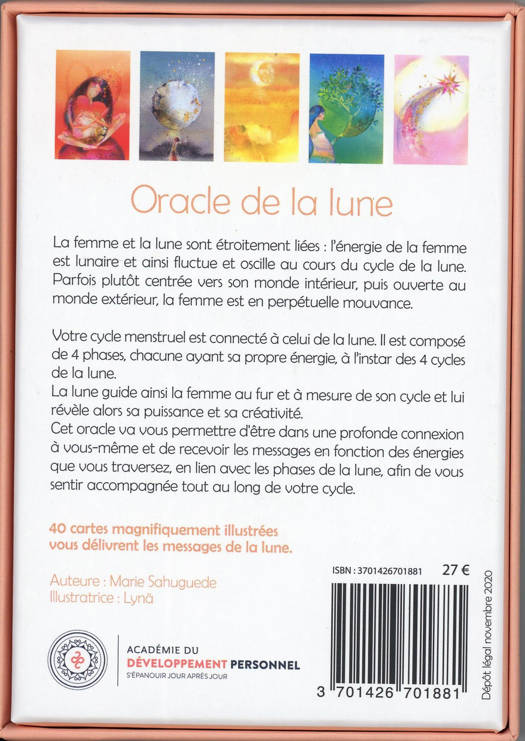« Découvrir son rythme, découvrir son pouvoir pour créer sa vie. » La femme et la lune sont étroitement liées : l’énergie de la femme est lunaire et ainsi fluctue et oscille au cours du cycle de la lune. Parfois plutôt centrée vers son monde intérieur, puis ouverte au monde extérieur, la femme est en perpétuellement mouvance. Votre cycle menstruel est connecté à celui de la lune. Il est composé de 4 phases, chacune ayant sa propre énergie, à l’instar des 4 cycles de la lune. La lune guide ainsi la femme au fur et à mesure de son cycle et lui révèle alors sa puissance et sa créativité. Cet oracle va vous permettre d’être dans une profonde connexion à vous-même et de recevoir les messages en fonction des énergies que vous traversez, en lien avec les phases de la lune, afin de vous sentir accompagnée tout au long de votre cycle.