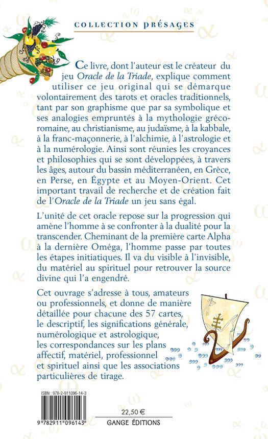 Ce livre, écrit par le créateur même du jeu, explique comment utiliser l’Oracle de la Triade. Il donne pour chacune des 57 lames le descriptif, la signification générale, les correspondances sur les plans affectif, matériel, professionnel et spirituel, la signification numérologique et astrologique ainsi que les associations particulières de tirage.