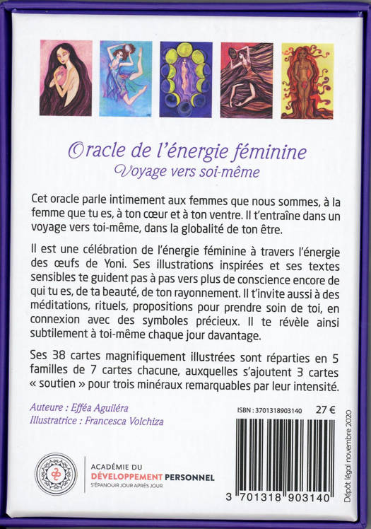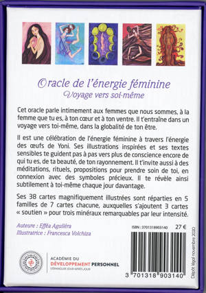 Cet oracle parle intimement aux femmes que nous sommes, à la femme que tu es, à ton cœur et à ton ventre. Il t’entraîne dans un voyage vers toi-même, dans la globalité de ton être. Il est une célébration de l’énergie féminine à travers l’énergie des œufs de Yoni. Ses illustrations inspirées et ses textes sensibles te guident pas à pas vers plus de conscience encore de qui tu es, de ta beauté, de ton rayonnement. Il t’invite aussi à des méditations, rituels, proposition pour prendre soin de toi en connexion avec des symboles précieux. Il te révèle ainsi subtilement à toi-même chaque jour davantage. Ses 38 cartes magnifiquement illustrées sont réparties en 5 famille de 7 cartes chacune, auxquelles s’ajoutent 3 cartes « soutien » pour 3 minéraux remarquables par leur intensité.