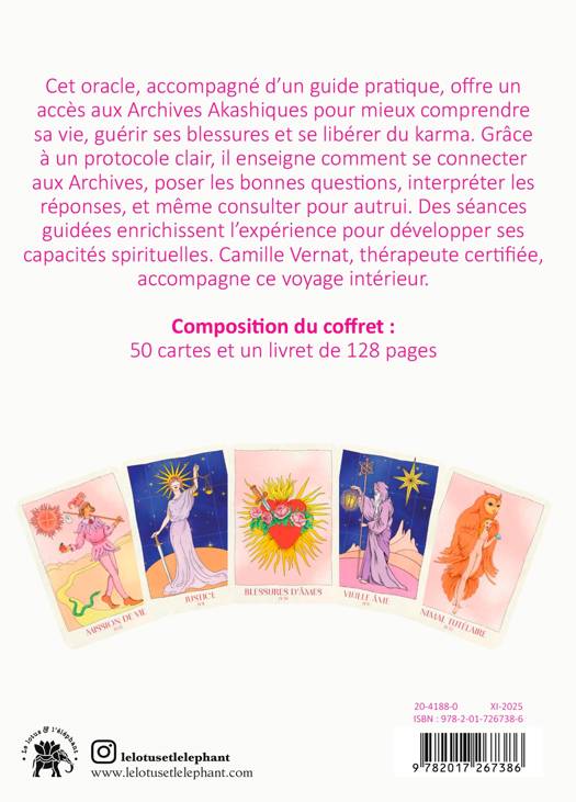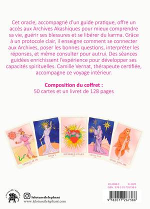 Cet oracle, accompagné d'un guide pratique, offre un accès aux Archives Akashiques pour mieux comprendre sa vie, guérir ses blessures et se libérer du karma. Grâce à un protocole clair, il enseigne comment se connecter aux Archives, poser les bonnes questions, interpréter les réponses, et même consulter pour autrui. Des séances guidées enrichissent l'expérience pour développer ses capacités spirituelles. Camille Vernat, thérapeute certifiée, accompagne ce voyage intérieur.