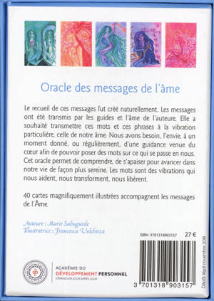 Le recueil de ces messages fut créé naturellement. Les messages ont été transmis par les guides et l’âme de l’auteure. Elle a souhaité transmettre ces mots et ces phrases à la vibration particulière, celle de notre âme. Nous avons besoin, l’envie, à un moment donné, ou régulièrement, d’une guidance venue du cœur afin de pouvoir poser des mots sur ce qui se passe en nous. Cet oracle permet de comprendre, de s’apaiser pour avancer dans notre vie de façon plus sereine. Les mots sont des vibrations qui nous aident, nous transforment, nous libèrent. 40 cartes magnifiquement illustrées accompagnent les messages de l’Âme.