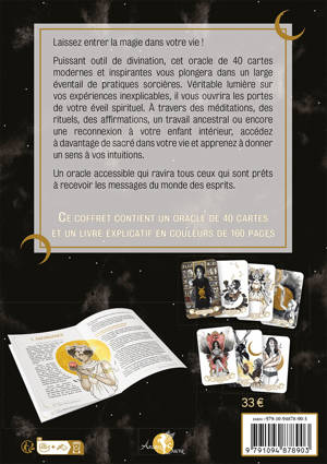 Laissez entrer la magie dans votre vie ! Puissant outil de divination, cet oracle de 40 cartes modernes et inspirantes vous plongera dans un large éventail de pratiques sorcières. Véritable lumière sur vos expériences inexplicables, il vous ouvrira les portes de votre éveil spirituel. À travers des méditations, des rituels, des affirmations, un travail ancestral ou encore une reconnexion à votre enfant intérieur, accédez à davantage de sacre´ dans votre vie et apprenez à donner un sens a` vos intuitions. Un oracle accessible qui ravira tous ceux qui sont prêts a` recevoir les messages du monde des esprits.