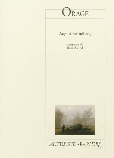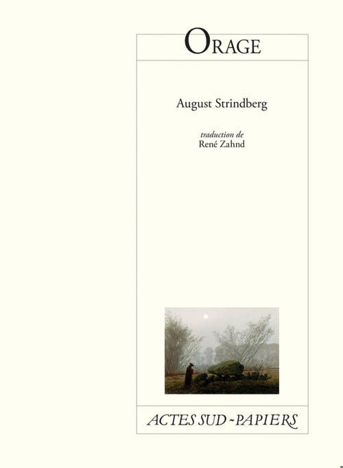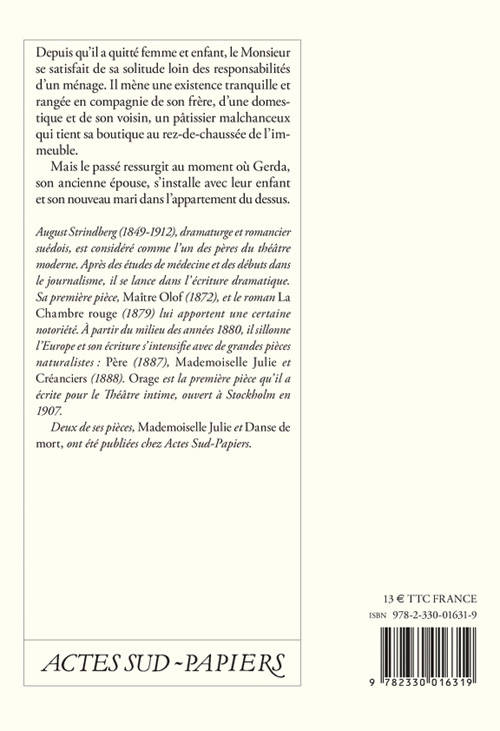 «August Strindberg (1849-1912), dramaturge et romancier suédois, est considéré comme l'un des pères du théâtre moderne. Après des études de médecine et des débuts dans le journalisme, il se lance dans l'écriture dramatique. Sa première pièce, »Maître Olof« (1872), et le roman »La Chambre rouge« (1879) lui apportent une certaine notoriété. A partir du milieu des années 1880, il sillonne l'Europe et son écriture s'intensifie avec de grandes pices naturalistes : »Pères« (1887), »Mademoiselle Julie« et »Créanciers« (1888). »Orage« est la première pièce qu'il a écrite pour le Théâtre intime, ouvert à Stocholm en 1907.» « Deux de ses pièces, »Mademoiselle Julie« et» Danse de mort«, ont été publiées chez Actes Sud-Papiers.»