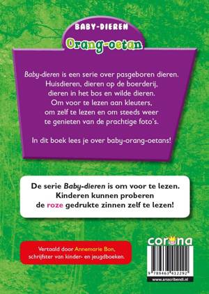 Baby-dieren is een serie over pasgeboren dieren. Huisdieren, dieren op de boerderij, dieren in het bos en wilde dieren. Om voor te lezen aan kleuters, om zelf te lezen en om steeds weer te genieten van de prachtige foto's. In dit boek lees je over baby-orang-oetans!