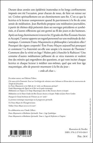 Durant deux années une épidémie inattendue et les longs confinements imposés ont été l’occasion, pour chacun de nous, de faire un retour sur soi. Croître spirituellement est un cheminement sans fin. C’est ce que la lectrice et le lecteur comprennent quand ils parviennent à la fin de cette année de méditation. Jean Bartholo propose une méditation journalière, à partir de thèmes déjà présentés dans ses ouvrages précédents et synthétisés, et d’autres réflexions qui ont germé au fil des jours et des humeurs. Après un long cheminement à travers les 33 grades du REAA, l’auteur apporte un regard personnel sur une multitude de thèmatiques. Comment Franc-Maçonnerie et philosophie s’articulent-elles ? Pourquoi des signes corporels ? Être Franc-Maçon aujourd’hui pourquoi et comment ? La fraternité est-elle une utopie à la mesure de l’homme ? Comment dire la vérité en loge ? Maître prêt à franchir le Rubicon ? Une centaine d’autres méditations jaillissent de ce vécu transmis et veulent être des miroirs qui engendrent des questions, et qui vont inciter chaque lectrice et chaque lecteur à méditer eux-mêmes, quel que soit leur âge maçonnique, afin de pouvoir murmurer à la fin du jour : « ordo ab chao ».