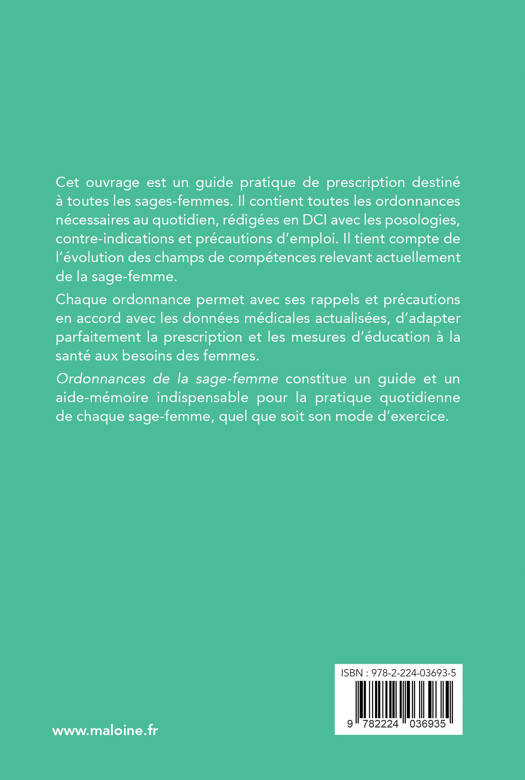 Cet ouvrage est un guide pratique de prescription destiné à toutes les sages-femmes. Il contient toutes les ordonnances nécessaires au quotidien, rédigées en DCI avec les posologies, contre-indications et précautions d’emploi. Il tient compte de l’évolution des champs de compétences relevant actuellement de la sage-femme. Chaque ordonnance permet avec ses rappels et précautions en accord avec les données médicales actualisées, d’adapter parfaitement la prescription et les mesures d’éducation à la santé aux besoins des femmes. Ordonnances de la sage-femme constitue un guide et un aide-mémoire indispensable pour la pratique quotidienne de chaque sage-femme, quel que soit son mode d’exercice.