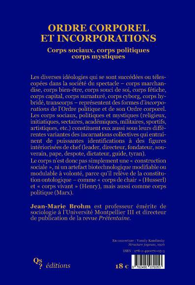 Les diverses idéologies qui se sont succédées ou télescopées dans la société du spectacle – corps marchandise, corps bien-être, corps souci de soi, corps fétiche, corps capital, corps surnaturé, corps cyborg, corps hybridé, transcorps –représentent des formes d’incorporations de l’Ordre politique et de son Ordre corporel. Les corps sociaux, politiques et mystiques (religieux, initiatiques, sectaires, académiques, militaires, sportifs, artistiques, etc.) constituent eux aussi sous leurs différentes variantes des incarnations collectives qui entraînent de puissantes identifications à des figures intériorisées de chef (leader, directeur, fondateur, souverain, pape, despote, dictateur, guide, tyran). Le corps n’est donc pas simplement une « construction sociale », ni un artefact biotechnologique modifiable ou modulable à volonté, parce qu’il relève de la constitution ontologique – comme « corps de chair » (Husserl) et « corps vivant » (Henry), mais aussi comme corps politique (Marx).