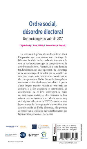 Le vote n’est-il qu’une affaire de chiffres ? C’est l’impression que peut donner une chronique de l’élection focalisée sur la courbe des intentions de vote ou sur les pourcentages de composition ou de distribution des voix. Pourtant, si le vote demeure fondamentalement une opération de comptage et de décomptage, il ne suffit pas de compter les voix pour comprendre comment les électrices et les électeurs perçoivent l’offre électorale, interprètent ses enjeux et font finalement leur choix. À partir d’une longue enquête réalisée au plus près des citoyens, à la fois qualitative et quantitative, les contributions de ce livre interrogent le poids des trajectoires sociales et des contextes de leur existence sur les façons de voter. Menée tout au long de la séquence électorale de 2017, l’enquête montre la persistance de l’ancrage social du vote face à un désordre inédit de l’offre électorale. Elle propose de renouveler la sociologie des variables sociales qui façonnent les préférences électorales.