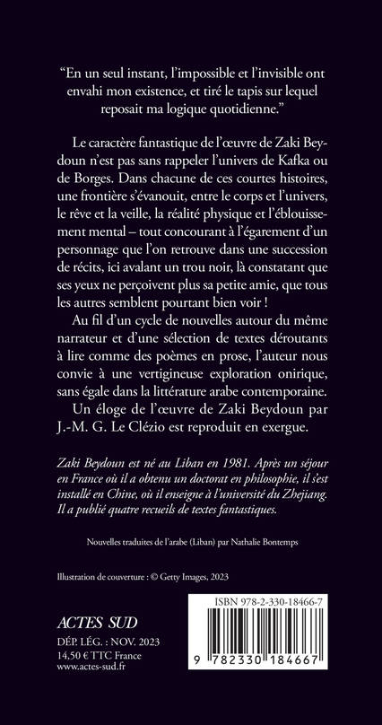 Le caractère fantastique de l'oeuvre de Zaki Beydoun n'est pas sans rappeler l'univers de Kafka ou de Borges. Dans chacune de ces courtes histoires, une frontière s'évanouit, entre le corps et l'univers, le rêve et la veille, la réalité physique et l'éblouissement mental - tout concourant à l'égarement d'un personnage que l'on retrouve dans une succession de récits, ici avalant un trou noir, là constatant que ses yeux ne perçoivent plus sa petite amie, que tous les autres semblent pourtant bien voir ! Au fil d'un cycle de nouvelles autour du même narrateur et d'une sélection de textes déroutants à lire comme des poèmes en prose, l'auteur nous convie à une vertigineuse exploration onirique, sans égale dans la littérature arabe contemporaine. Un éloge de l'oeuvre de Zaki Beydoun par J.-M. G. Le Clézio est reproduit en exergue.