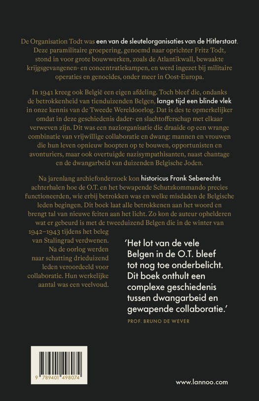 Na jarenlang archiefonderzoek kon historicus Frank Seberechts achterhalen hoe de O.T. en het bewapende Schutzkommando precies functioneerden, wie erbij betrokken was en welke misdaden de Belgische leden begingen. Dit boek laat alle betrokkenen aan het woord en brengt tal van nieuwe feiten aan het licht. Zo kon de auteur ophelderen wat er gebeurd is met de tweeduizend Belgen die in de winter van 1942-1943 tijdens het beleg van Stalingrad verdwenen.