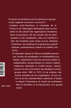 Comment les étudiants sont-ils devenus un groupe social, organisé et reconnu comme tel ? L'analyse socio-Âhistorique comparée de la France et de l'Allemagne révèle le rôle des organisations étudiantes dans ce processus. Par leur double rôle de représentation et de socialisation, elles ont contribué à faire des étudiants autre chose qu'une collection d'individus : un groupe aux caractéristiques, revendications, besoins et intérêts communs. En articulant rapport à l'État et sociabilité associative, formes de socialisation et manifestations politiques, négociations avec les pouvoirs publics et catégorisation bureaucratique ou encore création d'alliances nationales et conflits locaux, l'auteur retrace à la fois la formation des étudiants comme groupe entre 1880 et 1914 et les origines des formes actuelles de leur organisation, de leur action et de leur représentation collectives. Il éclaire l'importance du travail de mobilisation dans la formation et la reproduction d'un groupe social.