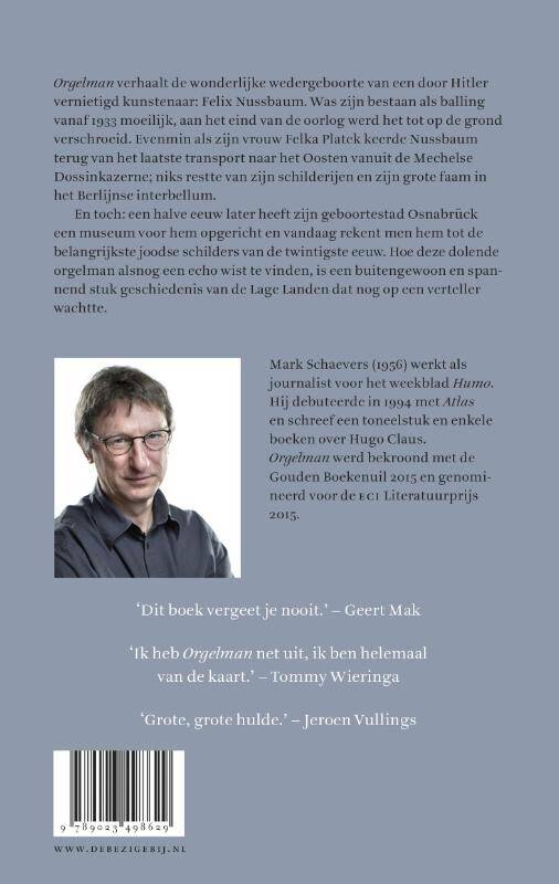 Geert Mak: ‘Orgelman heeft me overrompeld, een ander woord weet ik er niet voor. Ik kon het op den duur niet meer loslaten, dit weefsel van honderden puzzelstukjes waaruit langzaam het drama van twee levens boven water komt. Deze indrukwekkende biografie krijgt een extra lading door het verhaal dat Nussbaums schilderijen daarnaast vertellen: over de jaren dertig, over het angstige bestaan van de tienduizenden Duitse ballingen in Frankrijk, België en Nederland, over de jacht, de onderduik, de deportaties. Schaevers weet steeds dichter op de huid van zijn hoofdpersonen te kruipen, totdat het de lezer bijna de adem beneemt. Dit boek vergeet je nooit.’