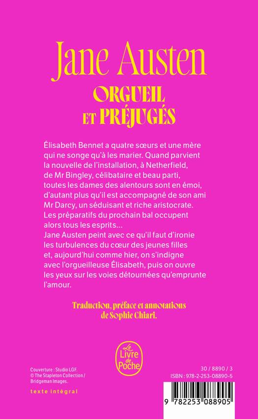 Élisabeth Bennet a quatre soeurs et une mère qui ne songe qu'à les marier. Quand parvient la nouvelle de l'installation à Netherfield, le domaine voisin, de Mr Bingley, célibataire et beau parti, toutes les dames des alentours sont en émoi, d'autant plus qu'il est accompagné de son ami Mr Darcy, un jeune et riche aristocrate. Les préparatifs du prochain bal occupent tous les esprits... Jane Austen peint avec ce qu'il faut d'ironie les turbulences du coeur des jeunes filles et, aujourd'hui comme hier, on s'indigne avec l'orgueilleuse Élisabeth, puis on ouvre les yeux sur les voies détournées qu'emprunte l'amour...Collection Classiques dirigée par Michel Zink et Michel Jarrety.Traduction, introduction, notes et dossier de Sophie Chiari.