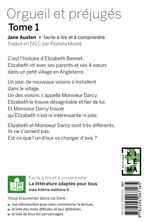C’est l’histoire d’Elizabeth Bennet.Elizabeth vit avec ses parents et ses 4 sœursdans un petit village en Angleterre.Un jour, de nouveaux voisins s’installentdans le village.Un des voisins s’appelle Monsieur Darcy.Elizabeth le trouve désagréable et fier de lui.Et Monsieur Darcy trouvequ’Elizabeth n’est ni intéressante ni jolie.Elizabeth et Monsieur Darcy sont très différents.Ils ne s’aiment pas.Est-ce que l’un d’eux va changer d’avis ?