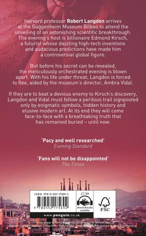 Robert Langdon, Harvard professor of symbology and religious iconology, arrives at the Guggenheim Museum Bilbao to attend the unveiling of a discovery that “will change the face of science forever”. The evening’s host is his friend and former student, Edmond Kirsch, a forty-year-old tech magnate whose dazzling inventions and audacious predictions have made him a controversial figure around the world. This evening is to be no