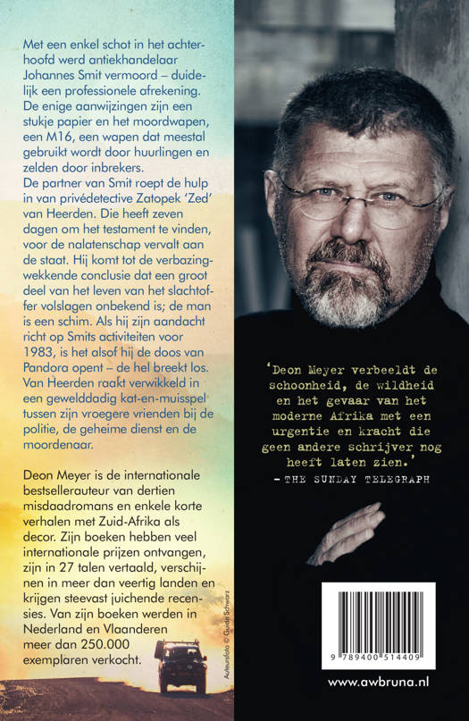 De partner van Smit roept de hulp in van privédetective Zatopek ‘Zed’ van Heerden. Die heeft zeven dagen om het testament te vinden, voor de nalatenschap vervalt aan de staat. Hij komt tot de verbazingwekkende conclusie dat een groot deel van het leven van het slachtoffer volslagen onbekend is; de man is een schim. Als hij zijn aandacht richt op Smits activiteiten voor 1983, is het alsof hij de doos van Pandora opent – de hel breekt los.