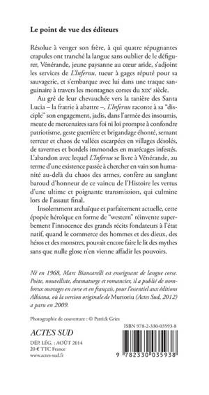 Au gré de leur chevauchée vers la tanière des Santa Lucia - la fratrie à abattre -, «L'Infernu» raconte à sa "disciple" son engagement, jadis, dans l'armée des insoumis, meute de mercenaires sans foi ni loi prompte à confondre patriotisme, geste guerrière et brigandage éhonté, semant terreur et chaos de vallées escarpées en villages désolés, de tavernes et bordels immondes en marécages infestés. L'abandon avec lequel «L'Infernu» se livre à Vénérande, au terme d'une existence passée à chercher en vain son humanité au-delà du chaos des armes, confère au sanglant baroud d'honneur de ce vaincu de l'Histoire les vertus d'une ultime et poignante transmission, qui culmine lors de l'assaut final.
