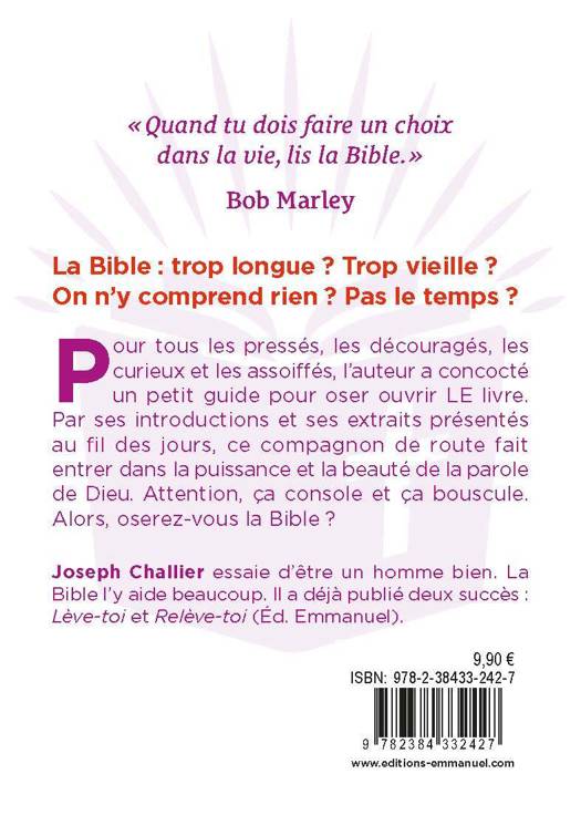 La Bible : trop longue ? Trop vieille ? On n’y comprend rien ? Pas le temps ? Pour tous les pressés, les découragés, ou tout simplement les curieux et les assoiffés, l’auteur a concocté un petit guide pour oser ouvrir LE livre, pas à pas. Les citations choisies et introduites sont proposées au fil des jours pour entrer dans la richesse de la Parole de Dieu et se laisser toucher par Lui. Une méthode clé en main pour plonger en eaux profondes !