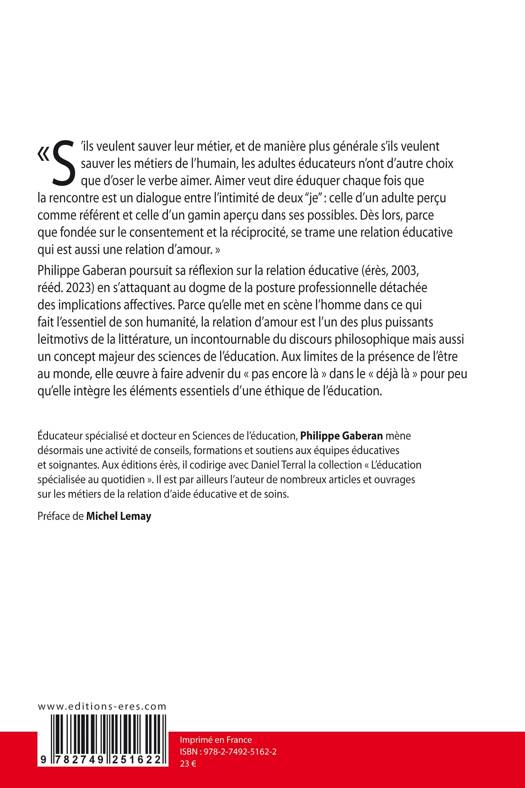 Philippe Gaberan poursuit sa réflexion sur la relation éducative (érès, 2003, rééd. 2016) en s'attaquant au dogme de la posture professionnelle détachée des implications affectives. Parce qu'elle met en scène l'homme dans ce qui fait l'essentiel de son humanité, la relation d'amour est l'un des plus puissants leitmotivs de la littérature, un incontournable du discours philosophique mais aussi un concept majeur des sciences de l'éducation. Aux limites de la présence de l'être au monde, elle œuvre à faire advenir du « pas encore là » dans le « déjà là » pour peu qu'elle intègre les éléments essentiels d'une éthique de l'éducation.