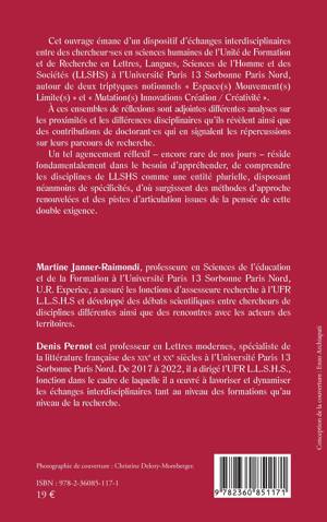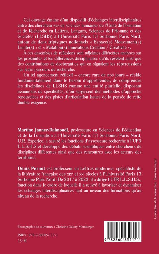 Cet ouvrage émane d'un dispositif d'échanges interdisciplinaires entre des chercheur·ses en sciences humaines de l'Unité de Formation et de Recherche en Lettres, Langues, Sciences de l'Homme et des Sociétés (LLSHS) à l'Université Paris 13 Sorbonne Paris Nord, autour de deux triptyques notionnels « Espace(s) Mouvement(s) Limite(s) » et « Mutation(s) Innovations Création / Créativité ». À ces ensembles de réflexions sont adjointes différentes analyses sur les proximités et les différences disciplinaires qu'ils révèlent ainsi que des contributions de doctorant·es qui en signalent les répercussions sur leurs parcours de recherche. Un tel agencement réflexif - encore rare de nos jours - réside fondamentalement dans le besoin d'appréhender, de comprendre les disciplines de LLSHS comme une entité plurielle, disposant néanmoins de spécificités, d'où surgissent des méthodes d'approche renouvelées et des pistes d'articulation issues de la pensée de cette double exigence.