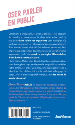 Marie-France Muller vous dévoile les astuces indispensables pour bien gérer la prise de parole en public : contrôler votre émotivité, créer une image mentale positive de la situation, bien utiliser votre voix, maîtriser le langage du corps… Fini le trac et l’appréhension, à vous les prises de parole réussies !