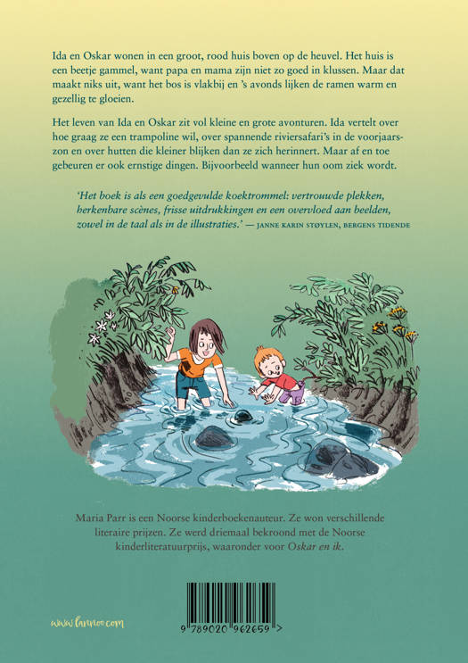 Ida en Oskar wonen in een groot, rood huis boven op de heuvel. Het huis is een beetje gammel, want papa en mama zijn niet zo goed in klussen. Maar dat maakt niks uit, want het bos is vlakbij en ’s avonds lijken de ramen warm en gezellig te gloeien.