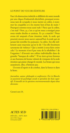Face à la destruction imbécile et délibérée de notre monde par une clique d'industriels décérébrés, pourquoi avons-nous tant de scrupules à nous mettre en colère, à nommer les coupables et à les mettre hors d'état de nuire ? Pourquoi sommes-nous aussi nuls ? Parce que la colère, c'est mal ? Non, ça, c'est ce qu'on nous a enseigné pour nous rendre dociles et anxieux. Et ça a marché ! Nous avons été amputés d'une émotion vitale, la seule qui pourrait encore nous sauver aujourd'hui, la seule qui ait jamais fait trembler les puissants : la colère. Est-elle réellement aussi mauvaise qu'on le dit ? Est-elle forcément synonyme de violence ? Qui a intérêt à nous faire croire cela ? Le moment n'est-il pas venu de la réhabiliter ? de l'organiser ? d'investir nos colères individuelles dans de grandes "banques de colère" ? Il ne tient qu'aux femmes et aux hommes de bonne volonté de s'emparer de la seule émotion qui puisse changer le monde. Les brutes qui nous assassinent, elles, n'hésitent pas. Un texte d'espoir et de combat, dans la fureur et dans la liesse.