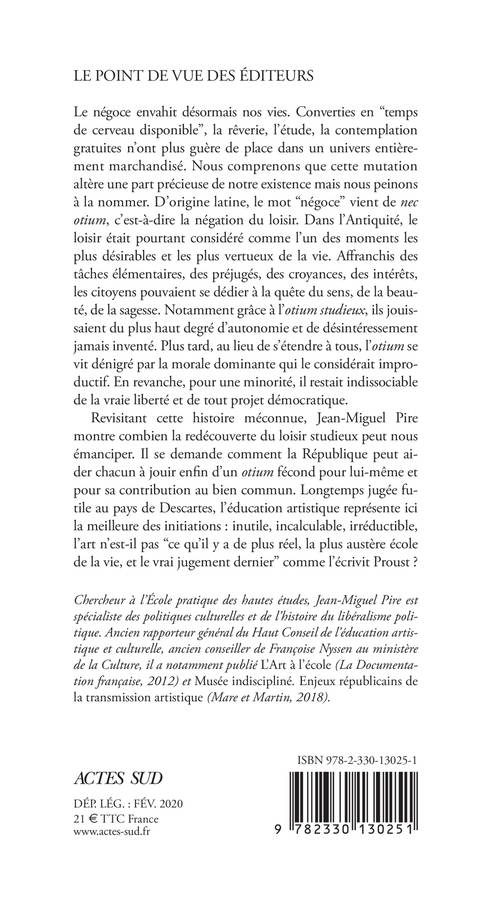 Revisitant cette histoire méconnue, Jean-Miguel Pire montre combien la redécouverte du loisir studieux peut nous émanciper. Il se demande comment la République peut aider chacun à jouir enfin d'un «otium »fécond pour lui-même et pour sa contribution au bien commun. Longtemps jugée futile au pays de Descartes, l'éducation artistique représente ici la meilleure des initiations : inutile, incalculable, irréductible, l'art n'est-il pas "ce qu'il y a de plus réel, la plus austère école de la vie, et le vrai jugement dernier" comme l'écrivit Proust?