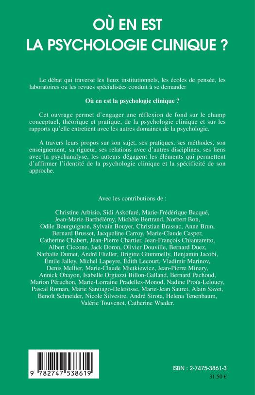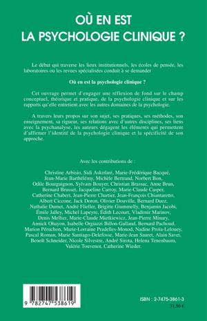 Le débat qui traverse les lieux institutionnels, les écoles de pensée, les laboratoires ou les revues spécialisées conduit à se demander "où en est la psychologie clinique?" Cet ouvrage permet d'engager une réflexion de fond sur le champ conceptuel, théorique et pratique, de la psychologie clinique et sur les rapports qu'elle entretient avec les autres domaines de la psychologie. A travers leurs propos sur son sujet, ses pratiques, ses méthodes, son enseignement, sa riguer, ses relations avec d'autres disciplines, ses liens avec la psychanlyse, les auteurs dégagent les éléments qui permettent d'affirmer l'identité de la psychologie clinique et la spécificité de son approche.