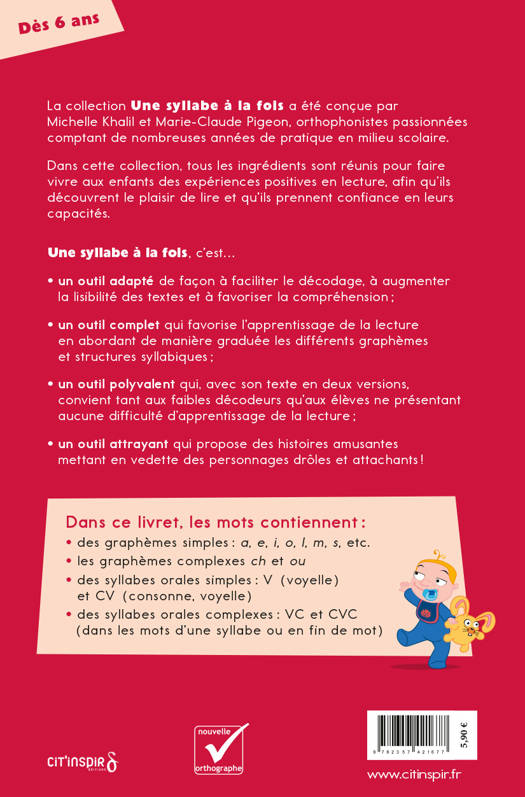 Des textes adaptés pour lire plus facilement ! Pour faciliter l’apprentissage de la lecture, les mots qui composent les histoires ont été sélectionnés en fonction de leur familiarité, de leur structure syllabique et des graphèmes* qu’ils contiennent. Plusieurs adaptations visuelles permettent de réduire la charge cognitive liée au décodage et de limiter l’encombrement perceptif. Les livrets contiennent deux fois la même histoire : dans la première version, syllabes orales, lettres muettes et graphèmes complexes sont mis en relief ; dans la seconde, ces adaptations ne sont pas présentes. Ce sont donc des outils polyvalents qui favorisent le transfert des acquis et qui conviennent à tous les enfants. Les histoires fantaisistes mettent en scène des personnages rigolos et attachants. La trame narrative captive les jeunes lecteurs tout en leur permettant de faire des prédictions. Les illustrations leur donnent aussi de nombreuses occasions de faire des inférences.