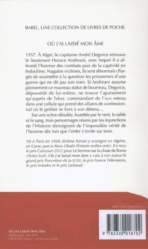 1957, Alger. Le capitaine André Degorce retrouve le lieutenant Horace Andreani avec lequel il a affronté l'horreur de la guerre d'Indochine. Désormais, les prisonniers passent des mains de Degorce à celles d'Andreani : les victimes sont devenues tortionnaires. Autour de Tahar, figure charismatique de la rébellion, ils devront trouver les armes pour affronter leurs trahisons intimes. Avec une magnifique intransigeance et dans une écriture somptueuse, Jérôme Ferrari révèle l'impossible vérité de l'homme quand l'enfer s'invite sur terre.