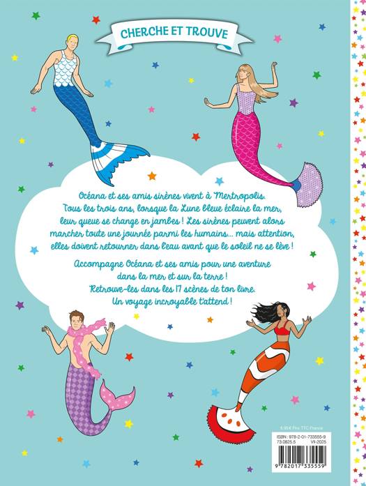 Un livre de 48 pages qui se lit comme un album et se joue comme un Cherche et Trouve, sur le thème des sirènes pop stars. Les voilà parties à l'aventure pour une journée magique (leurs queues se transforment en jambes et elles peuvent explorer le monde des humains) à travers 17 grandes scènes dans lesquelles il faut les repérer. Enfin, 10 éléments bonus par scène, listés dans les solutions à la fin du livre, sont aussi à chercher par le lecteur.