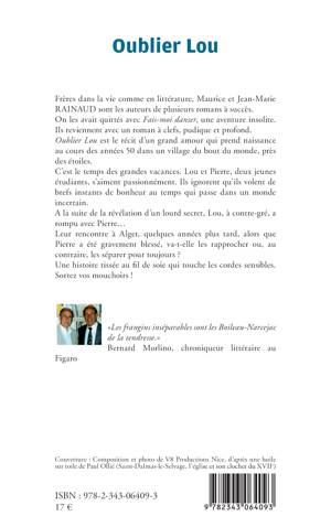 Frères dans la vie comme en littérature, Maurice et Jean-Marie RAINAUD sont les auteurs de plusieurs romans à succès. Oublier Lou est le récit d'un grand amour qui prend naissance au cours des années 50 dans un village du bout du monde, près des étoiles. C'est le temps des grandes vacances. Lou et Pierre, deux jeunes étudiants, s'aiment passionnément. Ils ignorent qu'ils volent de brefs instants de bonheur au temps qui passe dans un monde incertain. A la suite de la révélation d'un lourd secret, Lou, à contre-gré a rompu avec Pierre... Leur rencontre à Alger, quelques années plus tard, alors que Pierre a été gravement blessé, va-t-elle les rapprocher ou, au contraire, les séparer pour toujours ?