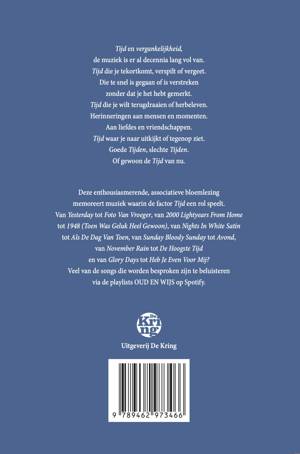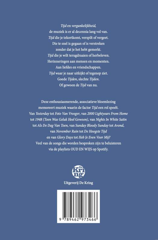 Tijd als thema in honderden pop- en rocksongs ***** Tijd en vergankelijkheid, de muziek is er al decennialang vol van. Tijd die je tekortkomt, verspilt of vergeet. Die te snel is gegaan of is verstreken zonder dat je het hebt gemerkt. Tijd die je wilt terugdraaien of herbeleven. Herinneringen aan mensen en momenten. Aan liefdes en vriendschappen. Tijd waar je naar uitkijkt of tegenop ziet. Goede tijden, slechte tijden. Deze enthousiasmerende, associatieve bloemlezing memoreert muziek waarin de factor Tijd een rol speelt. Van YESTERDAY tot FOTO VAN VROEGER, van NIGHTS IN WHITE SATIN tot ALS DE DAG VAN TOEN en van GLORY DAYS tot HEB JE EVEN VOOR MIJ? Veel van de songs die in dit boek besproken worden, zijn te beluisteren via de playlists "De Kring OUD EN WIJS" op Spotify. Een absolute aanrader voor álle muziekliefhebbers!