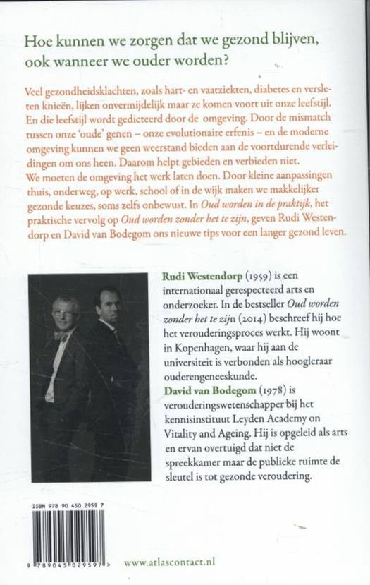Hoe kunnen we zorgen dat we gezond blijven, ook wanneer we ouder worden? Veel gezondheidsklachten, zoals hart- en vaatziekten, diabetes en versleten knieën, lijken onvermijdelijk maar ze komen voort uit onze leefstijl. En die leefstijl wordt gedicteerd door de omgeving. Door de mismatch tussen onze 'oude' genen – onze evolutionaire erfenis – en de moderne omgeving kunnen we geen weerstand bieden aan de voortdurende verleidingen om ons heen. Daarom helpt gebieden en verbieden niet. We moeten de omgeving het werk laten doen. Door kleine aanpassingen thuis, onderweg, op werk, school of in de wijk maken we makkelijker gezondere keuzes, soms zelfs onbewust. In Oud worden in de praktijk, het praktische vervolg op Oud worden zonder het te zijn, geven Rudi Westendorp en David van Bodegom ons nieuwe tips voor een langer gezond leven.