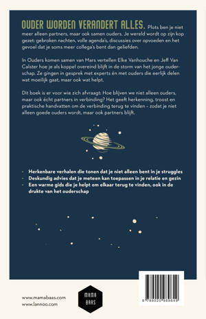 In Ouders komen samen van Mars vertellen Elke Vanhouche en Jeff Van Calster hoe je als koppel overeind blijft in de storm van het jonge ouderschap. Ze gingen in gesprek met experts én met ouders die eerlijk delen wat moeilijk gaat, maar ook wat helpt.
