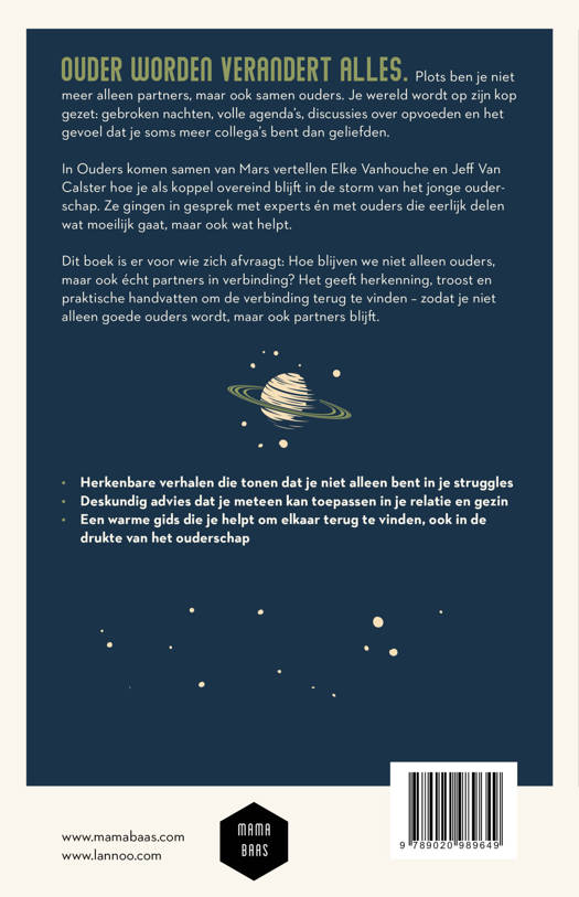 Ouder worden verandert alles. Plots ben je niet meer alleen partners, maar ook samen ouders. Je wereld wordt op zijn kop gezet: gebroken nachten, volle agenda's, discussies over opvoeden en het gevoel dat je soms meer collega's bent dan geliefden. In Ouders komen samen van Mars vertellen Elke Vanhouche en Jeff Van Calster hoe je als koppel overeind blijft in de storm van het jonge ouderschap. Ze gingen in gesprek met experts én met ouders die eerlijk delen wat moeilijk gaat, maar ook wat helpt. Dit boek is er voor wie zich afvraagt: Hoe blijven we niet alleen ouders, maar ook écht partners in verbinding? Het geeft herkenning, troost en praktische handvatten om de verbinding terug te vinden - zodat je niet alleen goede ouders wordt, maar ook partners blijft.