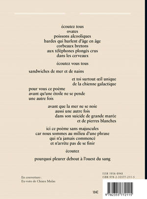 Ouessant, Enez Eusa, est une apocalypse et un droit de bris. Rédigé volontairement sans majuscule, il est un poème de contrebande et de naufrage, de photos péries en mer et de paroles de sauvetage. Chant épique, il a été conçu comme une médiation et une transe, depuis le sémaphore de l'île, devant les rochers déchirant un Atlantique vengeur et amoureux. Ces mots-tempête, dédiés à son ami le druide et explorateur du mystère Breton, Gwenc'hlan Le Scouëzec, est aussi un hommage à toute la poésie bretonne, traversée par les figures de Bruno Geneste, Eugène Guillevic, Yvon Le Men et Paul Keineg. Venu du plus profond de ses montagnes occitanes, Serge Pey convoque ici, dans une longue hallucination acérée, les oiseaux, les passés et les avenirs, les mythologies, les faits divers, mais aussi les fantômes de toutes les Bretagnes qui habitent encore aujourd'hui le cÅur des Bretons. Poème écologique, engagé et amoureux, Ouessant, Enez Eusa a obtenu le Prix Xavier Grall en 2020.