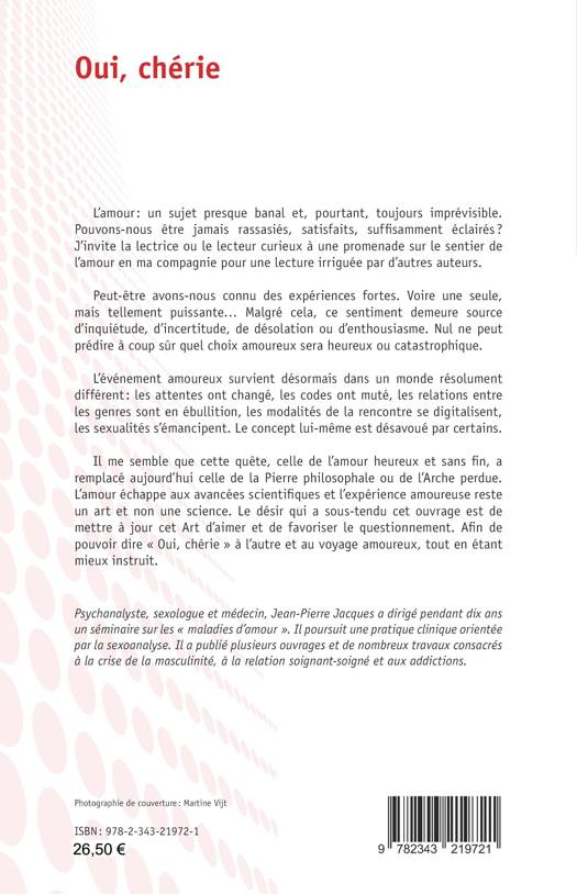 L'amour: un sujet presque banal et, pourtant, toujours imprévisible. Pouvons-nous être jamais rassasiés, satisfaits, suffisamment éclairés ? Peut-être avons-nous connu des expériences fortes. Voire une seule, mais tellement puissante...Malgré cela, ce sentiment demeure source d'inquiétude, d'incertitude, de désolation ou d'enthousiasme. Nul ne peut prédire à coup sûr quel choix amoureux sera heureux ou catastrophique. L'amour échappe aux avancées scientifiques et l'expérience amoureuse reste un art et non une science. Le désir qui a sous-tendu cet ouvrage est de mettre à jour cet Art d'aimer et de favoriser le questionnement. Afin de pouvoir dire Oui, chérie à l'autre et au voyage amoureux, tout en étant mieux instruit.