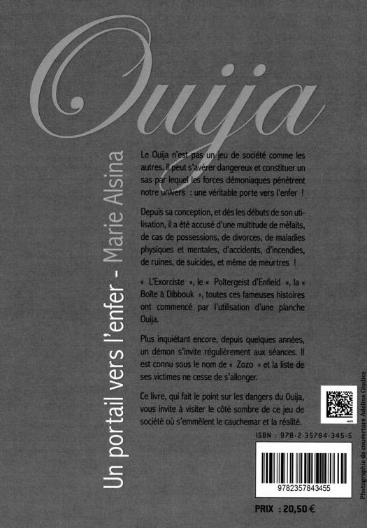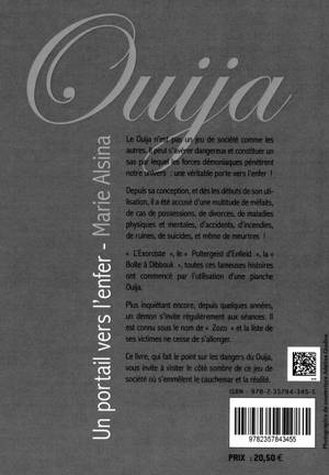 Le Ouija n’est pas un jeu de société comme les autres. Il peut s’avérer dangereux et constituer un sas par lequel les forces démoniaques pénètrent notre univers, une véritable porte vers l’enfer ! Depuis sa conception et dès les débuts de son utilisation il a été accusé d'une multitude de méfaits, de cas de possessions, de divorces, de maladies physiques et mentales, d'accidents, d'incendies, de ruines, de suicides, et même de meurtres ! L’Exorciste, le Poltergeist d’Enfield, la Boîte à Dibbouk, toutes ces fameuses histoires ont commencé par l’utilisation d’une planche Ouija. Plus inquiétant encore, depuis quelques années, un démon s'invite régulièrement aux séances. Il est connu sous le nom de Zozo et la liste de ses victimes ne cesse de s’allonger. Ce livre, qui fait le point sur les dangers du Ouija, vous invite à visiter le côté sombre de ce jeu de société où s’emmêlent le cauchemar et la réalité.