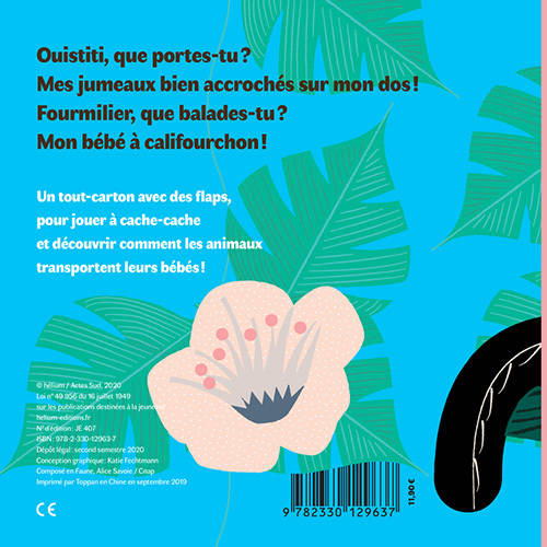 Un tout-carton avec des flaps pour les tout-petits, pour jouer à cache-cache et découvrir comment les animaux transportent leurs bébés!