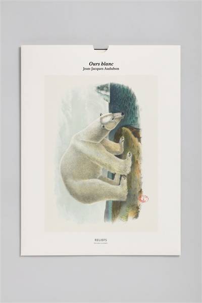 Entre 1846 et 1853, The Viviparous Quadrupeds of North America est publié en 3 volumes de 150 planches de 56 x 71 cm, imprimées et coloriées à la main par J.T. Bowen de Philadelphie, et 3 volumes de textes. Cette planche 91 a été « dessinée d’après nature par J.W. Audubon », le fils qui prend souvent à cette époque le relais de son père dont la santé décline et reproduit son style à s’y méprendre, en particulier dans le traitement pictural des décors naturels. Ursus maritimus y est raconté sur douze pages par son cosignataire John Bachman (1790-1874), pasteur luthérien anti-esclavagiste et naturaliste spécialiste des animaux du sud des États-Unis, dont le Unity of the Human Race, publié en 1850, contribuera au développement de la théorie de l’évolution. On découvre ainsi que les auteurs, bien qu’ayant exploré les régions septentrionales, se basent honnêtement et quasi intégralement sur les témoignages et descriptions de leurs prédécesseurs : « Nous avons voyagé ensemble, cher lecteur, dans les vallons profonds et les forêts sauvages, par-delà les marais et par-dessus les montagnes, maîtrisé les courants du Mississippi, vogué sur nos vastes lacs et nos côtes interminables, du Labrador au Mexique ; nous avons poursuivi le bison dans les grandes prairies, chassé le daim timide, piégé le castor et pris le renard ; en sommes, nous avons capturé, représenté et décrit la plupart de nos animaux ; mais avec votre permission, nous allons vous envoyer en expédition avec les navigateurs les plus intrépides des mers polaires à la recherche de l’ours blanc, car nous n’avons pas vu ce remarquable habitant des régions glacées de nos côtes évoluer dans ses froids déserts natifs… »
