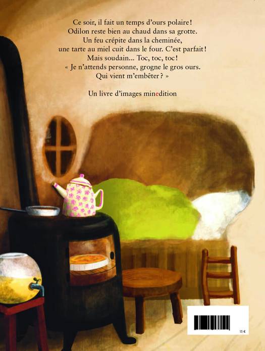 Ce soir, il fait un temps d’ours polaire ! L’ours Odilon reste bien au chaud dans sa grotte. Un feu crépite dans la cheminée, une tarte au miel cuit dans le four. C’est parfait ! Mais soudain, on frappe à la porte. Et voilà Odilon nez-à-nez avec une jolie petite mésange, qui semble bien décidée à faire son nid sur sa tête… Parviendra-t-il à s’en débarrasser ?