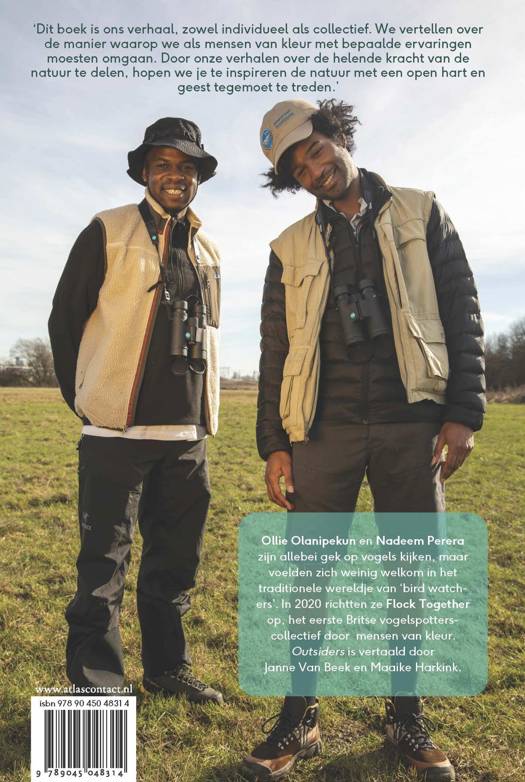 Ollie Olanipekun en Nadeem Perera waren allebei gek op vogels kijken, maar voelden zich weinig welkom in het traditionele wereldje van bird watchers. Om de ondervertegenwoordiging van mensen van kleur onder vogelaars recht te trekken, richtten ze Flock Together op. Wat begon als een wandeling in het park om de hoek, leidde al snel tot een wereldwijde beweging gericht op activisme, community-building en het samen beleven van de natuur. Outsiders is zowel een krachtig persoonlijk verhaal over het door-breken van vastgeroeste patronen als een bevlogen manifest voor inclusievere natuurorganisaties. Het stimuleert iedereen om naar buiten te gaan en al dat moois wat de natuur te bieden heeft te omarmen. Want de natuur is van ons allemaal.